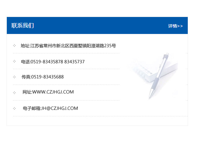 地址:常州市新北區友邦商務大廈1幢16、17層  電話:0519-85101652  傳真:0519-85112595  郵編:213022  網址:www.cz-jiayue_cn.clzycmj.com  郵箱:xiajifengaa@163.com